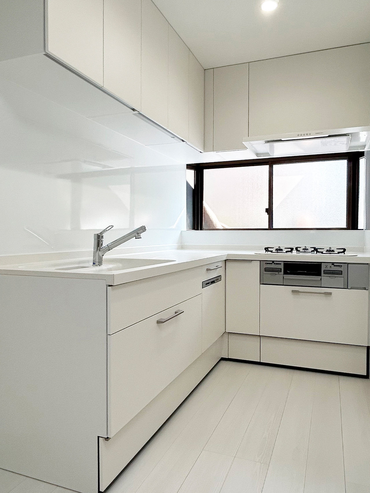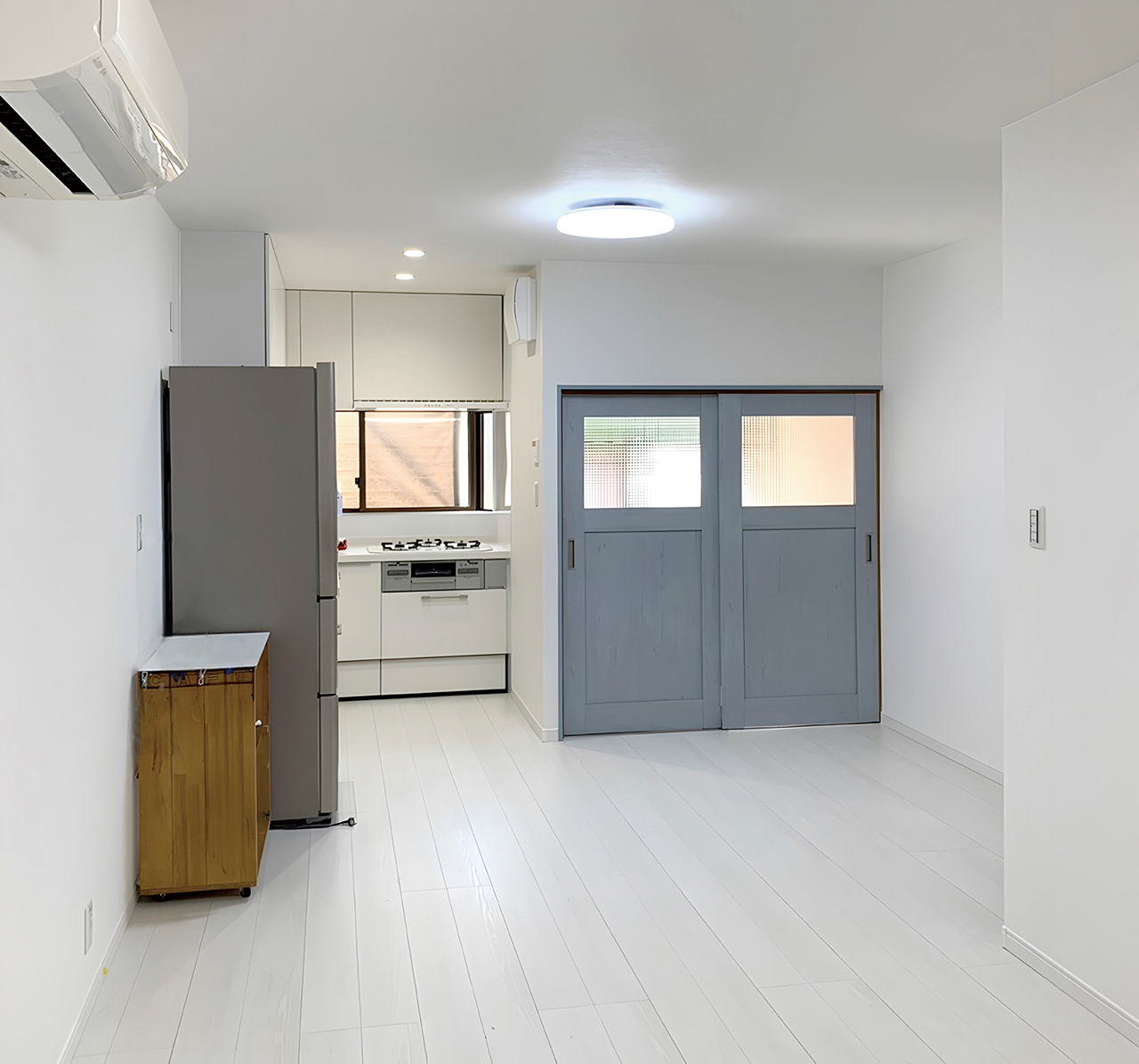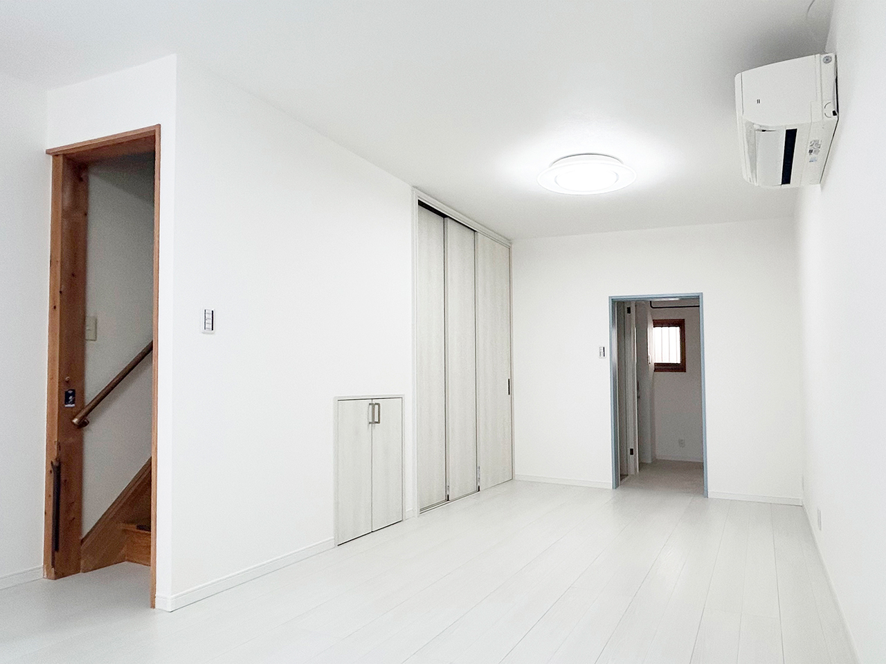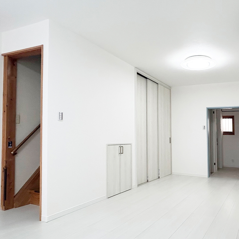 2025年竣工 奥に長く大きな窓がない1階を白基調にしたことで 部屋全体が明るくなりました。
