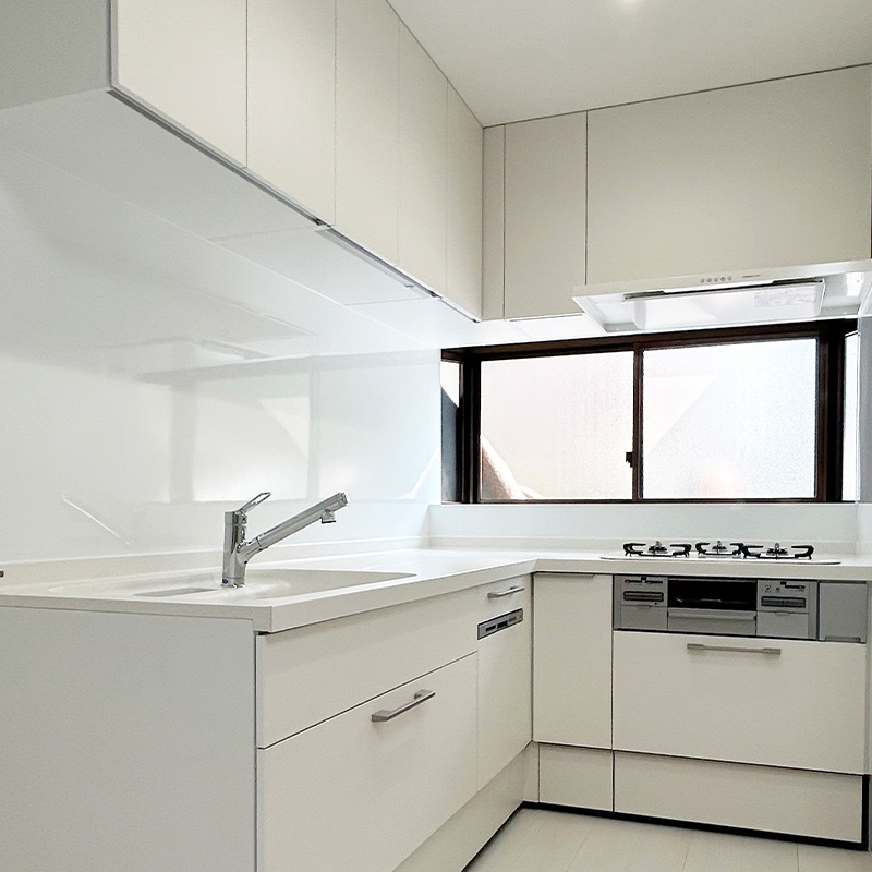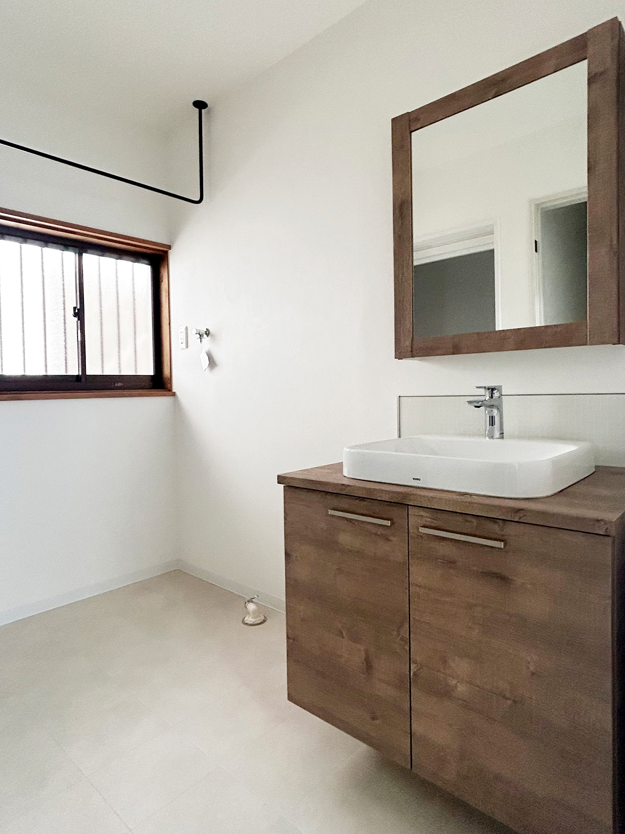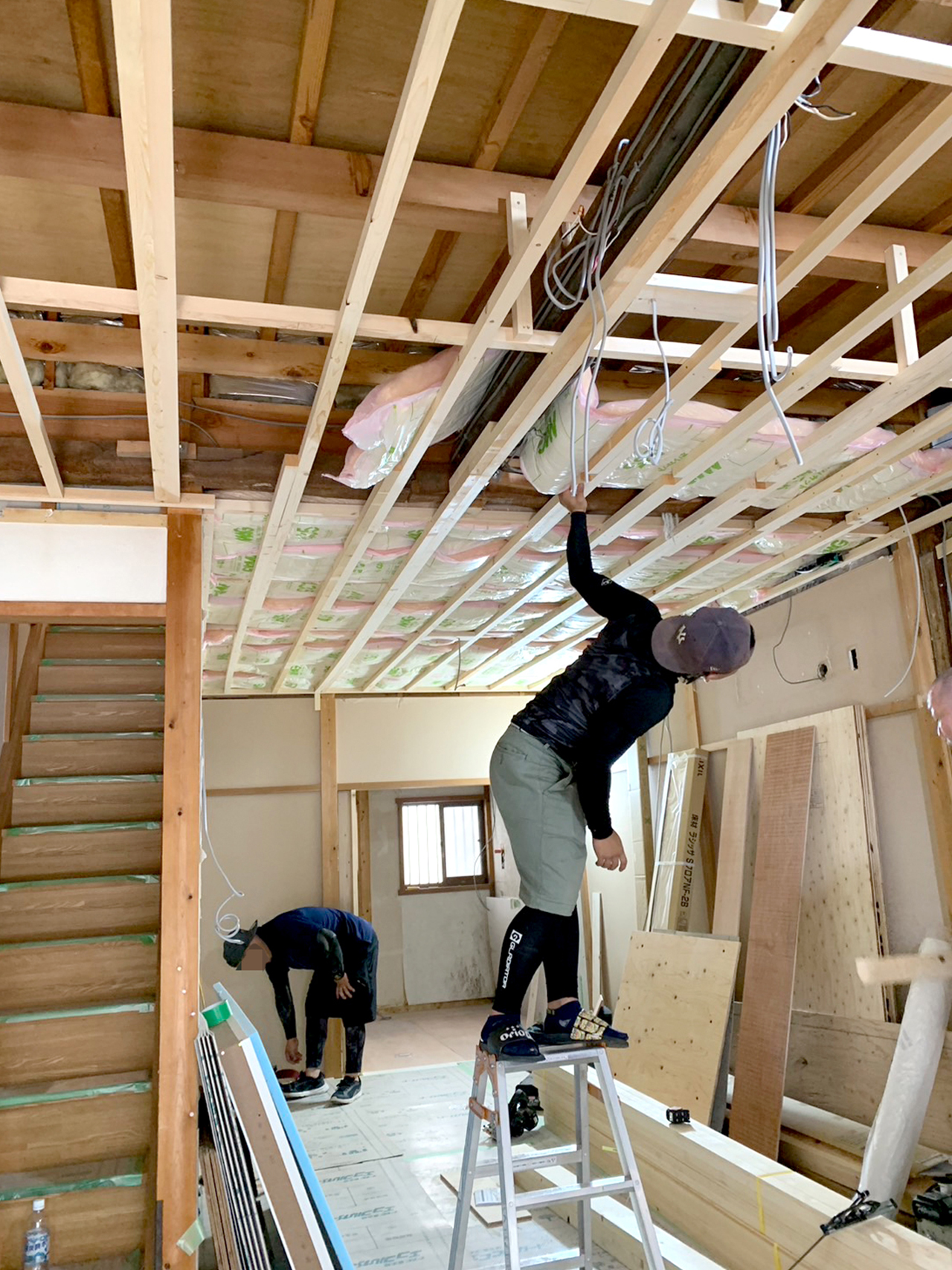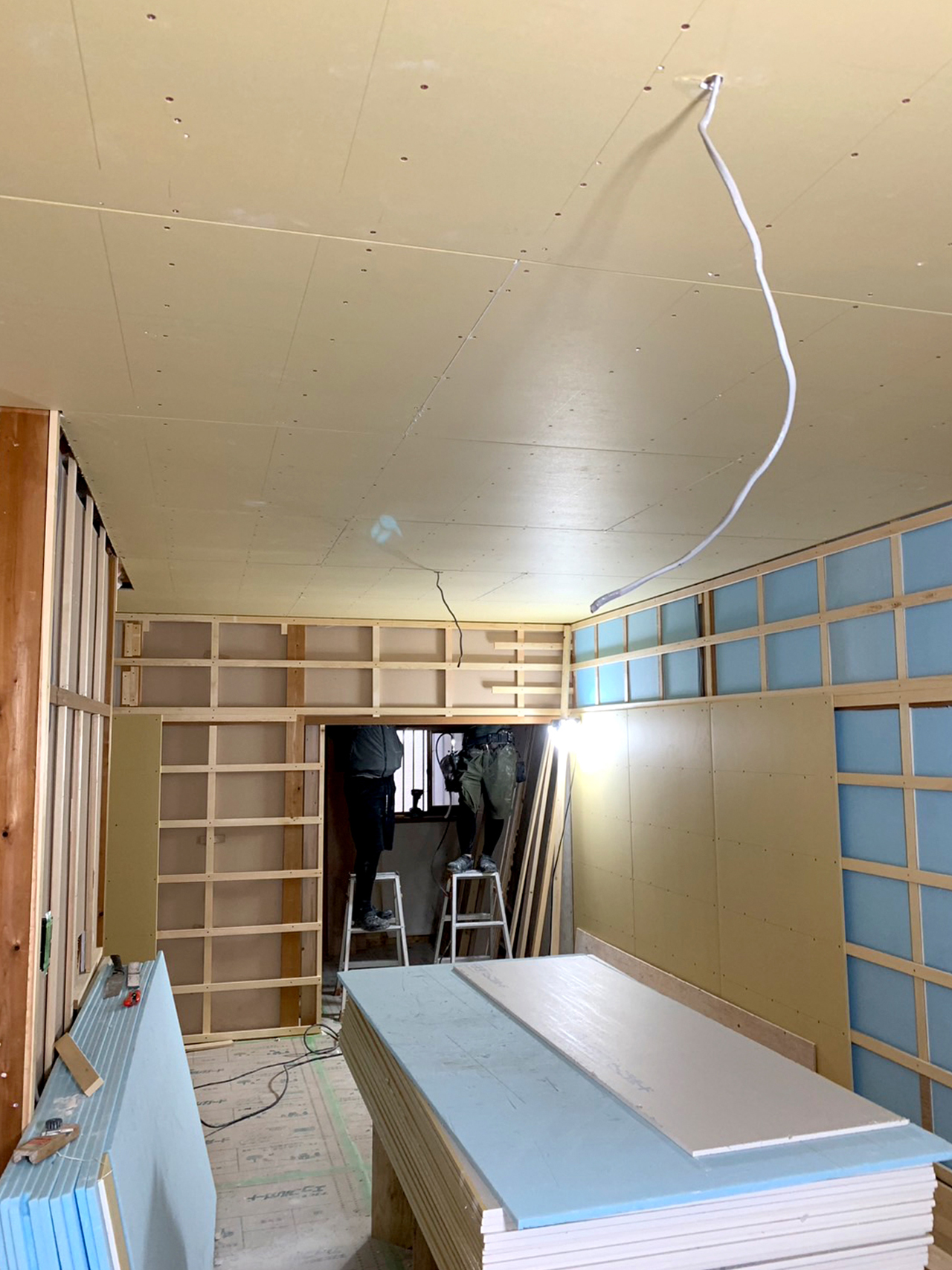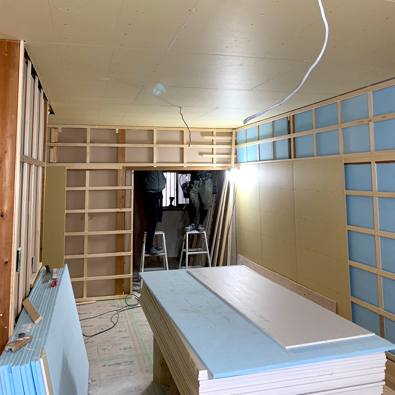 2025年竣工 奥に長く大きな窓がない1階を白基調にしたことで 部屋全体が明るくなりました。